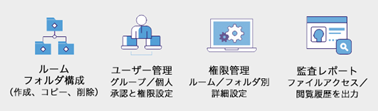 ルーム、フォルダ別に詳細な権限管理ができ、監査レポートで、ファイルアクセスや閲覧履歴を監査レポートとして出力することができます。グループや個人単位で権限設定も可能です。