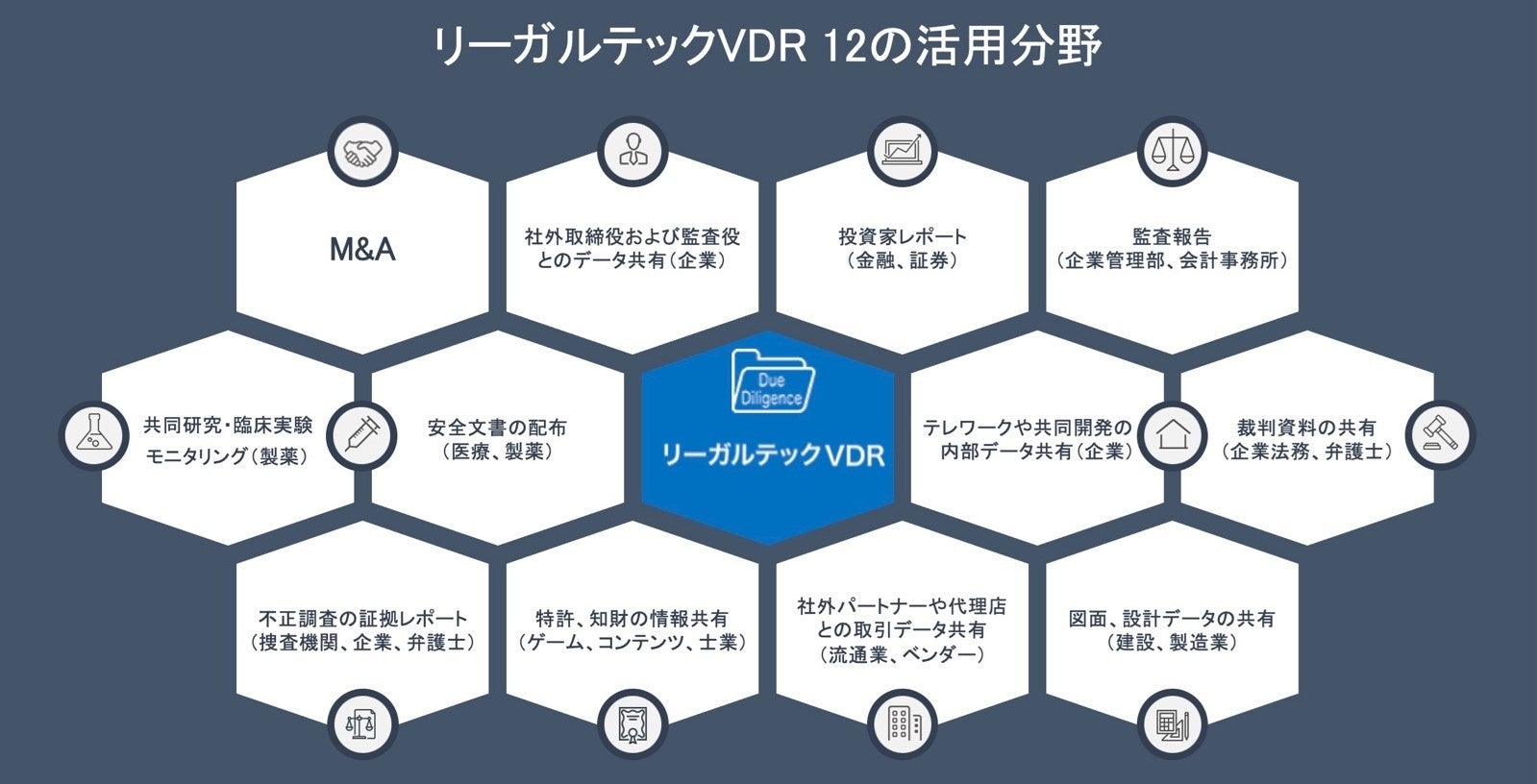 「リーガルテックVDR」は、M&A、企業が、社外取締役および監査役とデータ共有したり、金融、証券では、投資家レポートのやり取り、企業管理部、会計事務所では、監査報告に使用し、製薬会社は、共同研究・臨床実験モニタリング、医療、製薬では、安全文書の配布、企業がテレワークや共同開発の内部データ共有に使ったり、企業法務や弁護士が裁判資料の共有に活用し、捜査機関や企業、弁護士が不正調査の証拠レポートを共有し、ゲーム、コンテンツ、士業の方が特許、知財の情報共有に活用、流通業、ベンダーが社外パートナーや代理店との取引データの共有に利用し、建設、製造業の方が図面、設計データの共有に活用するなど、様々な分野で活用することができます。