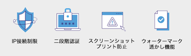 AWS ISO/IEC 27001:2013の認証を受け、電子透かし、画面キャプチャ/プリント防止、IP接続制限、2段階認証機能などを搭載し、堅牢なセキュリティでドキュメントの流出を防止します。