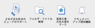 モバイルアプリ上で様々な形式のファイルを閲覧することができます。フォルダ・ファイルの検索も簡単で、重要文書・共有文書にマークをつけることもできます。ドキュメントがアップロードされたときに自動的に通知されるように設定する機能も搭載しています。