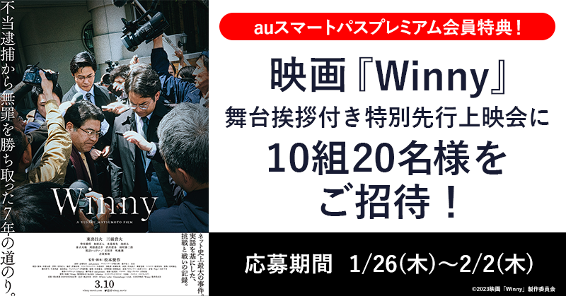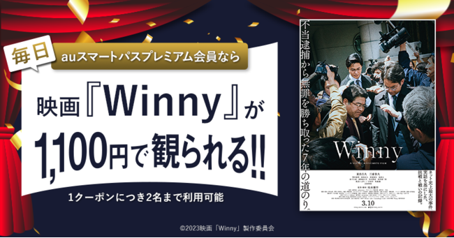 なお、「auスマートパスプレミアム」では、特定の映画作品※が、上映期間中、土日平日いつでも1,100円(一般・大学生)で鑑賞できる特典を、2022年5月からスタートしており、本作『Winny』もその対象作品です。