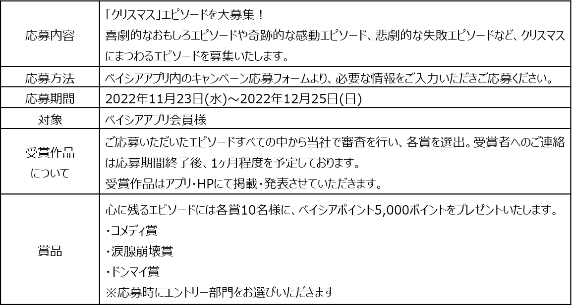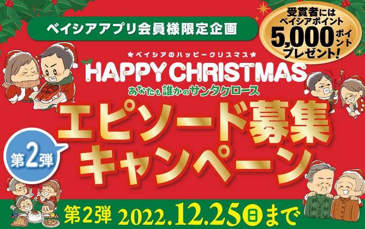 株式会社ベイシア(本社:群馬県前橋市、代表取締役社長:相木孝仁)は、11月23日(水)~12月25日(日)の期間に、ベイシアアプリ内で「あなたも誰かのサンタクロース」と題して、クリスマスにまつわるエピソードを募集いたしました。たくさんのご応募をいただき、誠にありがとうございました。第2弾の“ハッピークリスマス賞”として受賞作品を決定しましたので発表いたします。