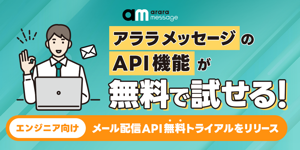 今回リリースした「エンジニア向け メール配信API無料トライアル」は、システムにメール配信機能の連携を検討するエンジニアが、より手軽に「アララ メッセージ」のメール配信API機能を試用できるようにしたものです。エンジニアは、「アララ メッセージ」のWEBサイトから直接申し込むだけで、トライアルに必要な情報を自動で取得でき、すぐに実装できるようになります。検討スピードに加え、導入や開発に着手する時間も早められることから、メール配信機能を連携させたサービスの提供までにかかる期間の短縮が見込めます。
