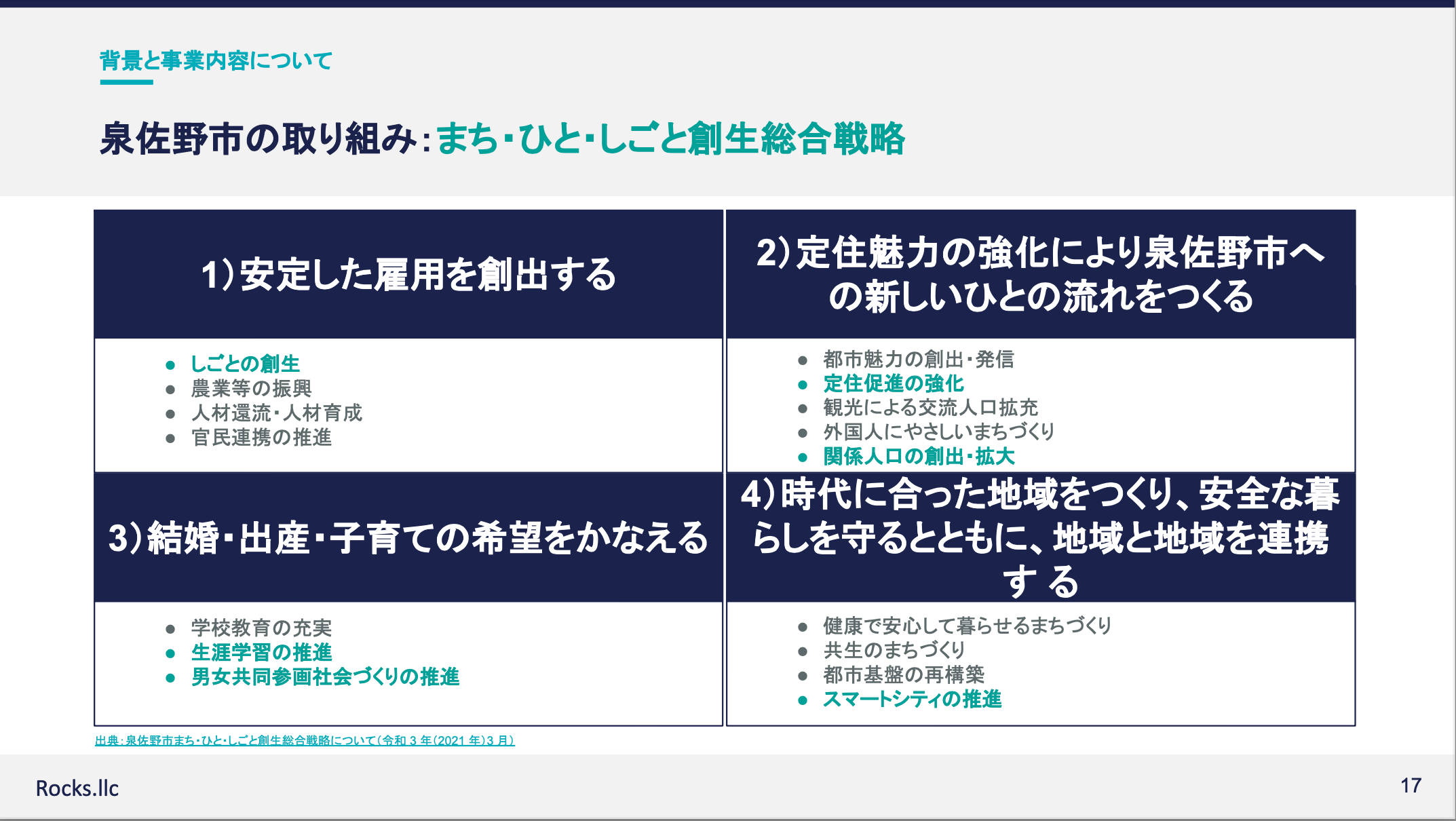 泉佐野市は、移住促進と雇用創出のため、「まち・ひと・しごと創生総合戦略」に基づく施策を実施。