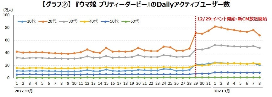『ウマ娘』は、ユーザー規模が最も大きい20代のユーザーが更に増加した点が注目されます。人気の高いキャラクターに新しい衣装を実装しCMにも起用することで、同世代ユーザーの中で、プレイ経験のなかったユーザーや、一旦離脱してしまったユーザーが復帰しプレイし始めたということが考えられます。