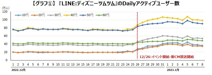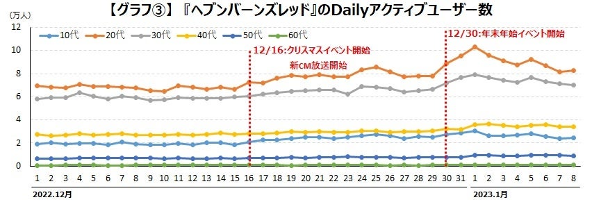 iGageのデータを見ると、その施策の影響は明確に確認できます。12月26日以降、どの年代でもアクティブユーザーが増加していますが、特にもともとはユーザーの割合が少なかった10代と20代に関しては、倍近くユーザーが増加しています。【グラフ①】