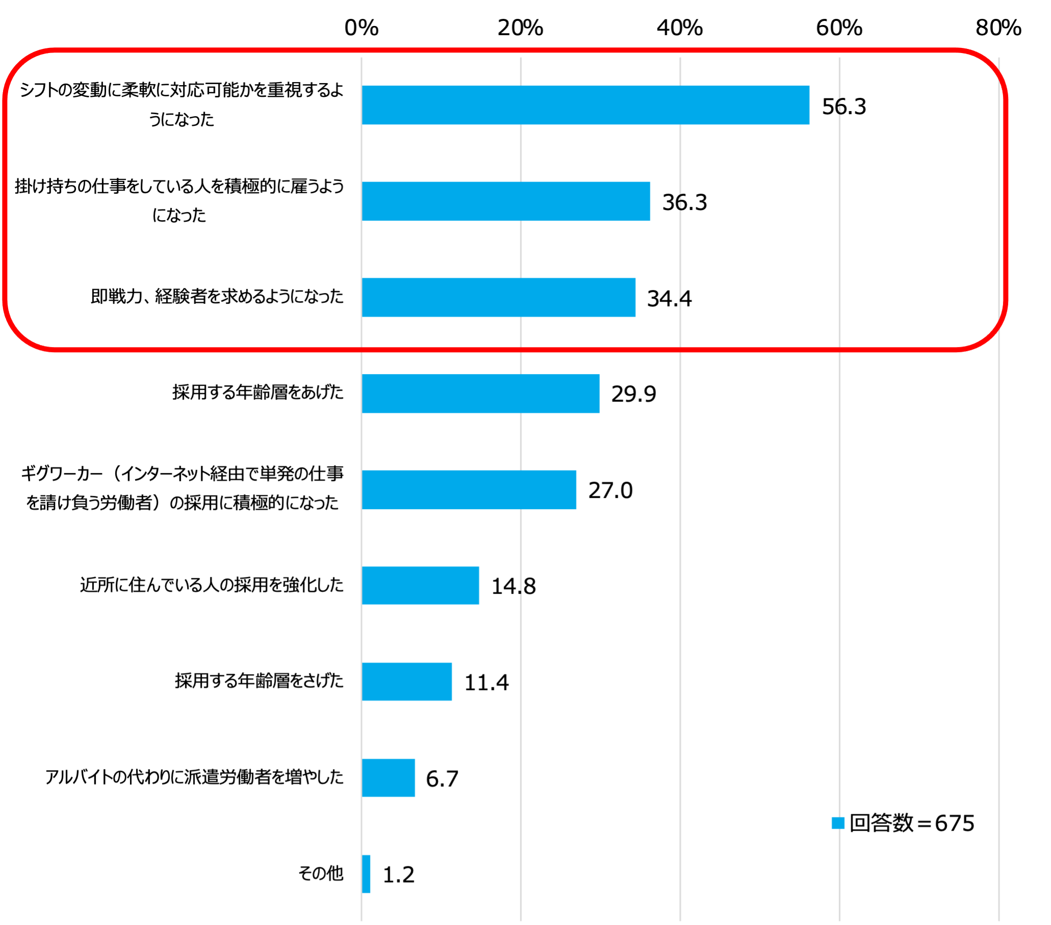 コロナ禍で変化した採用基準の内容をみると、「シフトの変動に柔軟に対応可能かを重視するようになった」が56.3%と最も高く半数を占め、次いで「掛け持ちの仕事をしている人を積極的に雇うようになった」が36.3%、「即戦力、経験者を求めるようになった」が34.4%となった。【図5】
