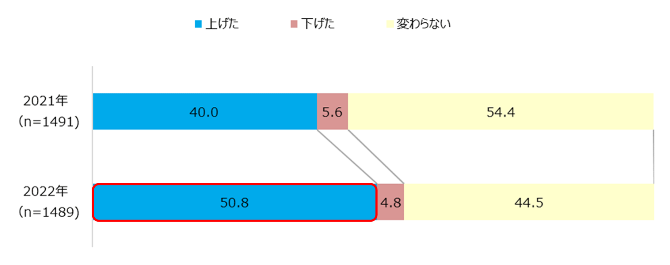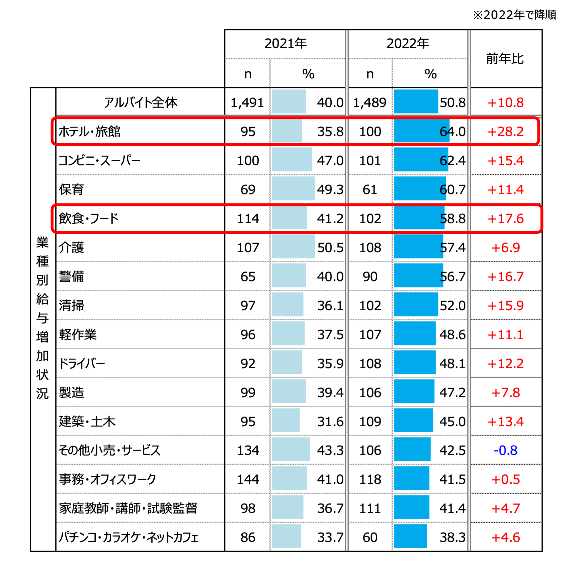 直近半年間でアルバイトの給与を「上げた」企業の割合は50.8%と半数を超え、前年より10.8pt増加した。業種別では、[ホテル・旅館]が64.0%と最も高くなり、前年比でも28.2pt増と最も増加した。次いで[飲食・フード]で17.6pt増(58.8%)となった。【図1、2】