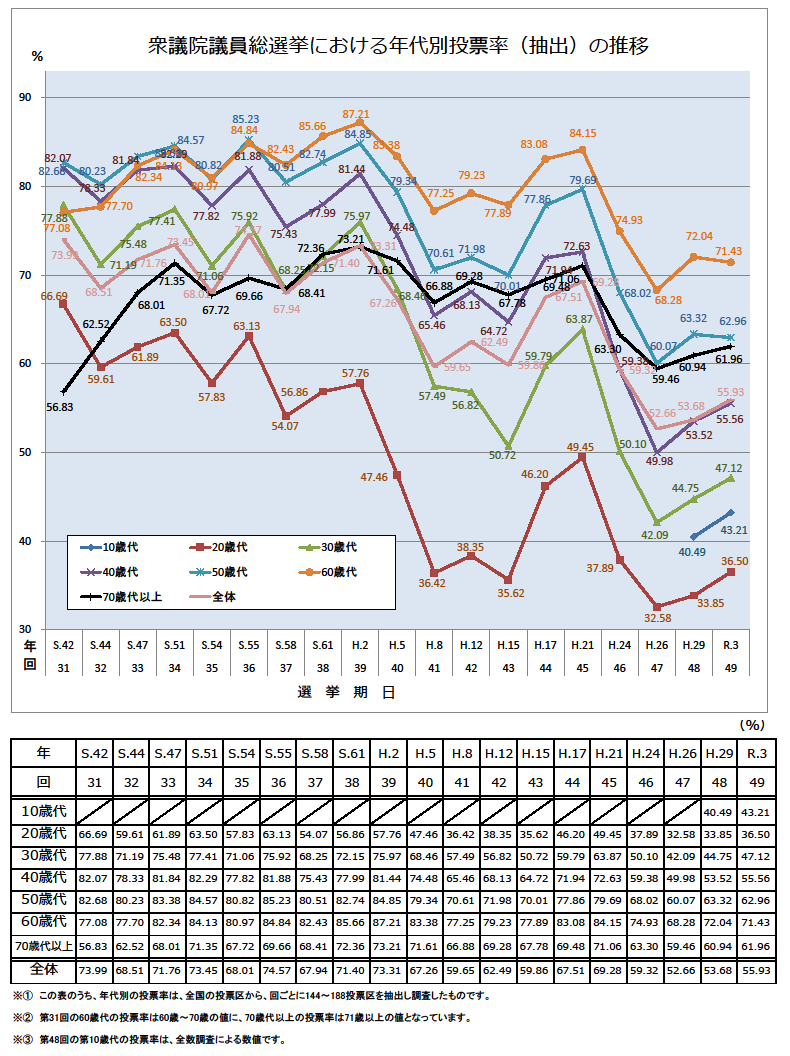 10歳代:43.21%、20歳代:36.50%、30歳代:47.12%、全年代を通じた投票率:55.93%
