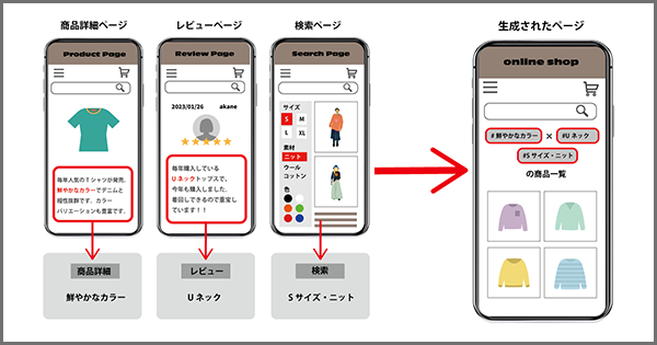 主にECサイトなどWebサイトの中の説明文やカスタマーレビューのようなテキスト情報をAIで解析し、関連するキーワードを抽出してLP(ランディングページ)を自動生成します。
