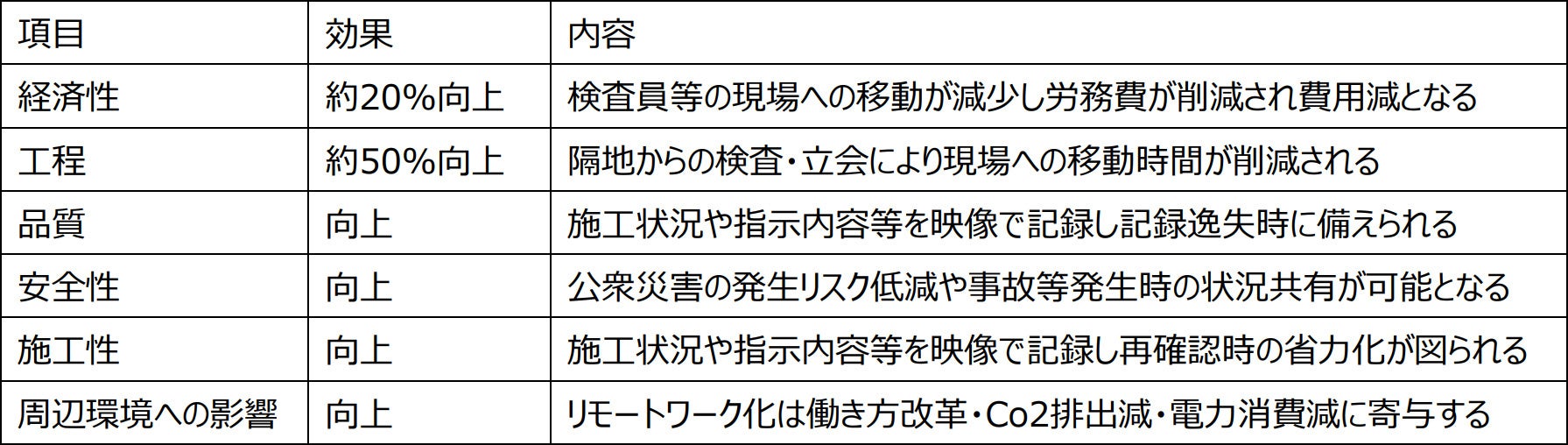本技術は、従来技術との比較において、以下のとおり全ての項目(6項目)で活用効果(向上)が認められました。これは、現在「遠隔臨場ツール」としてNETIS登録されている技術(自社調べ:本技術を含む8技術)の中でも唯一であり、利用者にとって非常に有益な技術であることが裏付けられました。
