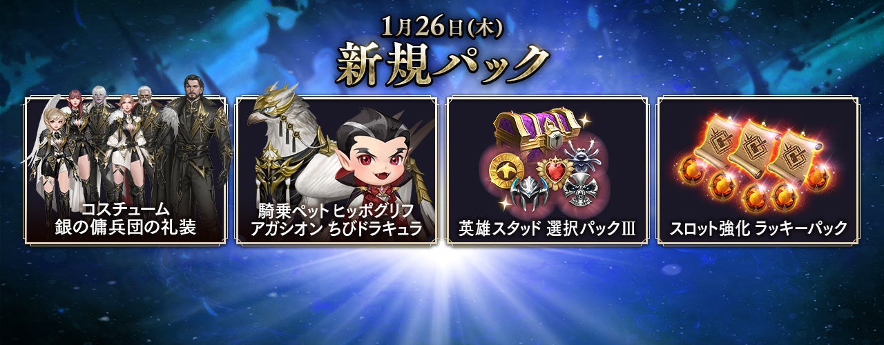 また、キャラクターの成長に大変役立つ「スロット強化ラッキーパック」や「英雄スタッド選択パックⅢ」などのお得な商品も追加しております。
