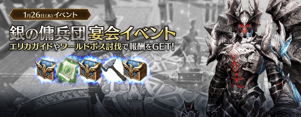 また、イベント期間中はマグナディンがイベントテーマ「銀の傭兵団宴会」に変更され、マグナディンの石像より、経験値獲得量とモンスターコア獲得率が6倍(+500%)増加するバフを獲得できる「マグナディンバフイベント」や、ソウルストーンのランクアップに必要なアデナ費用が80%OFFになるイベントも同時開催いたします。