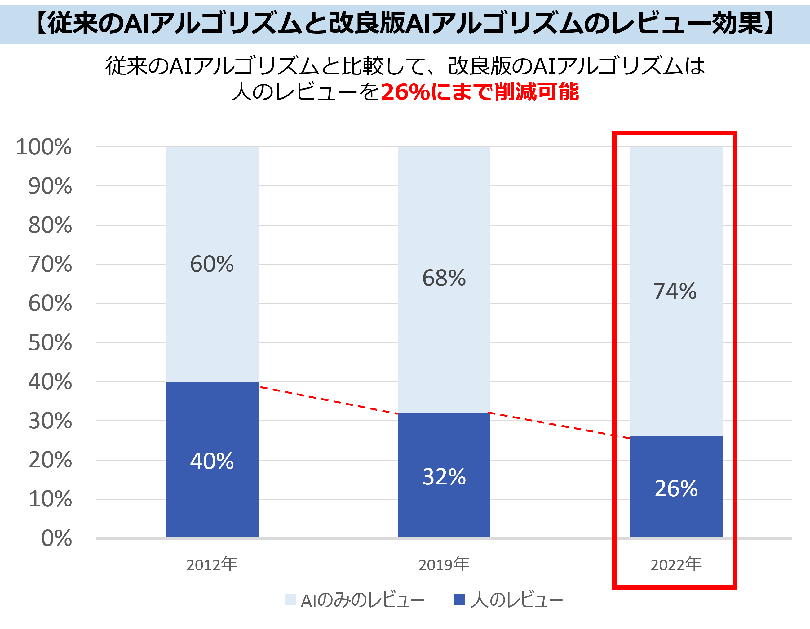 KIBIT Automatorは、訴訟に関わる企業や弁護士の膨大なレビュー作業についてAIを活用して支援します。証拠に関連のある文書と関連のない文書をAIが高い精度で見極めることで、業務の効率化と高度化を実現してきました。さらに2022年に改良した最新のAIアルゴリズムを実際の案件において活用したところ、従来のAIアルゴリズムを用いた場合と比較して、理論上*、「証拠として関連がある」と評価された文書の80%を得るために、人の目を必要とするレビュー割合を32%から26%にまで削減できることが確認されました。この結果は、本製品がデジタルフォレンジック業務のさらなる効率化と高度化により、作業時間やそれにかかるコスト削減に寄与することを証明するものであると言えます。