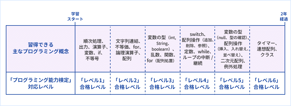 - テキストプログラミングコースの学習内容と習熟イメージ