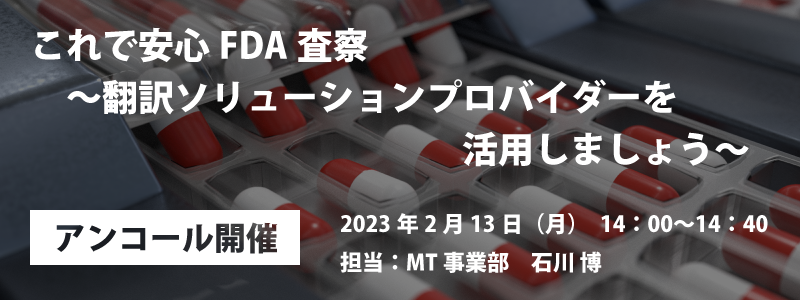 厳格化するFDA査察に対応するために今から準備しておくことは何か?本ウェビナーでは、FDAガイダンス等を効率よく自動翻訳できる環境を社内に整備する方法を弊社AI翻訳「T-4OO」の解説を交えてご紹介いたします。