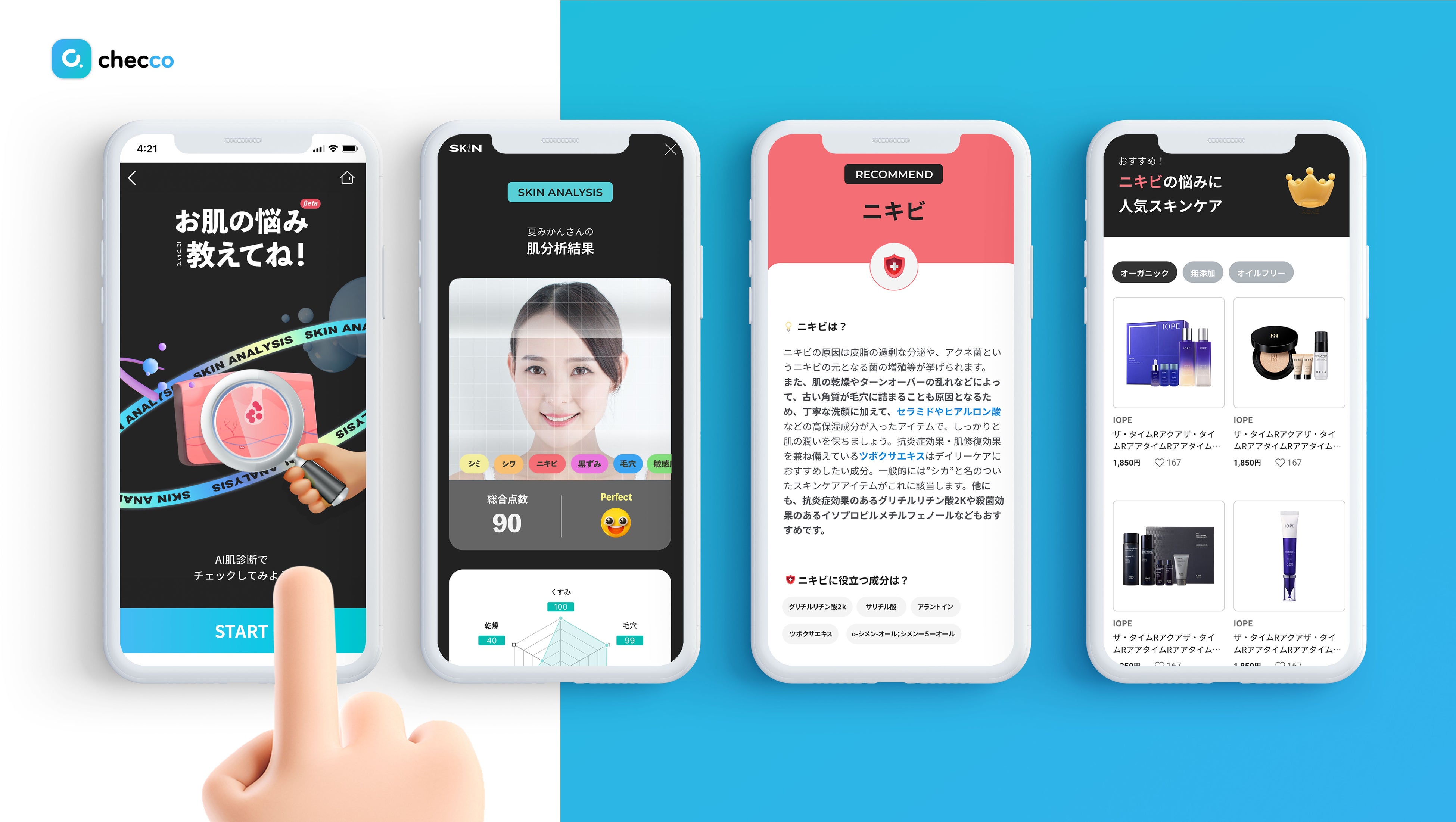Checcoは、AIによる肌診断・肌分析の結果によって悩みを解決できるコスメ商品を紹介し、日本の消費者が韓国コスメの成分と新商品情報を手軽に入手できる日本唯一のKビューティープラットフォームです。