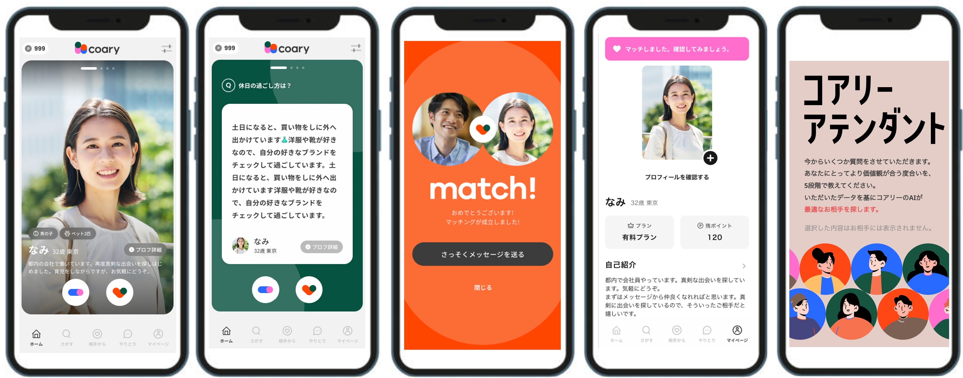「都合のつく曜日・時間」を設置・表示できる為、効率よくコミュニケーションをとれる。さらに、質問に回答するだけで自身の価値観に合う方を推奨してくれる「コアリーアテンダント」を搭載。
