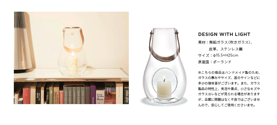 DESIGN WITH LIGHT は2015 年に権威あるドイツデザイン賞も獲得している、従来のキャンドルの概念を変えたといわれる名品。雫のように丸みのある温かなデザインは、北欧のキャンドル文化を大切に受け継ぎながらも、コンテンポラリーな表情を与えてくれます。吹きガラスに本革のストラップとステンレスを組み合わせたスタイルで、屋内外、場所を選ばず持ち運べるのが魅力です。
