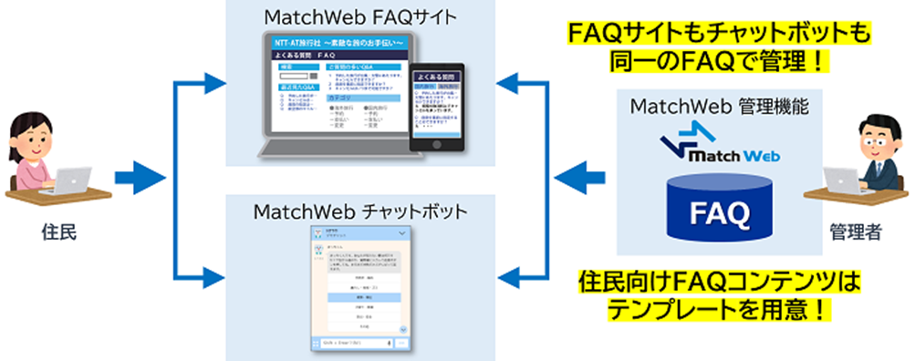 ・MatchWeb FAQサイトとMatchWebチャットボットは、双方ともに共通の管理画面でFAQの更新を行うだけで情報を発信することができます。