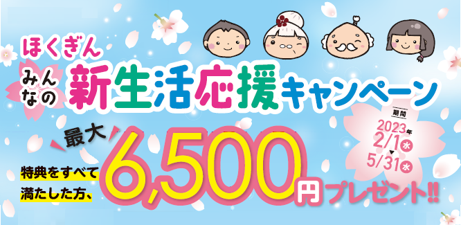 北陸銀行(頭取 中澤 宏)は、この春新たなスタートを切られるお客さまを応援すべく、2023年2月1日(水)より「ほくぎんみんなの新生活応援キャンペーン2023」を実施いたします。当行で新たに口座開設していただくお客さまや、給与振込を指定されるお客さまなどを対象に、最大で現金6,500円をプレゼントいたします。