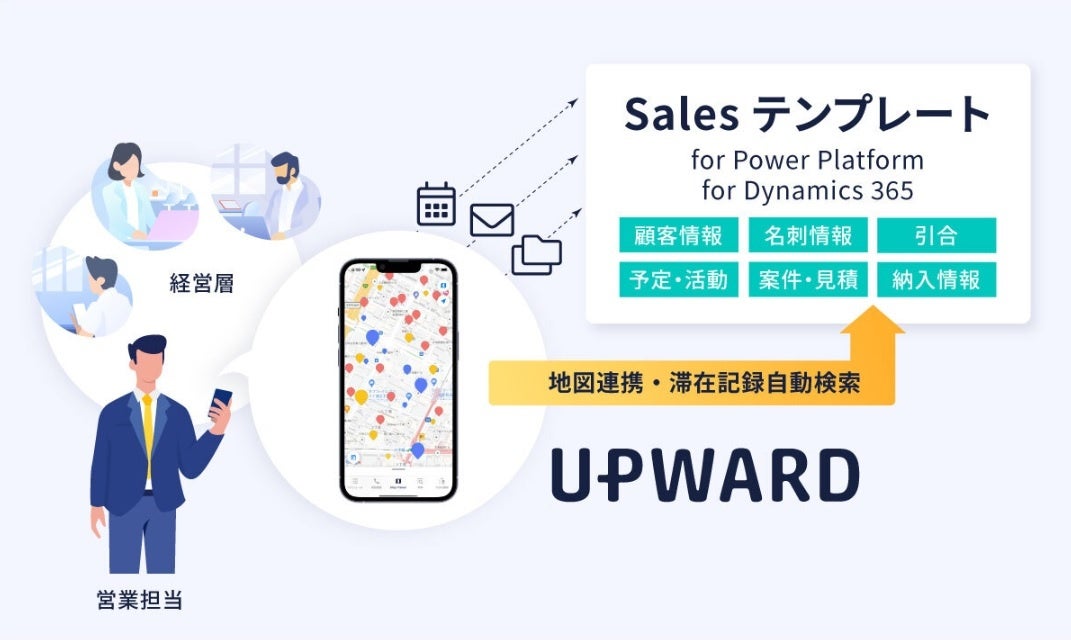 Dynamics 365 や Power Platform を基盤として開発された営業支援テンプレートに、UPWARDが提供する地図情報をもとにした顧客情報や、滞在記録の入力の自動化といった機能が加わることにより、お客様の営業現場におけるCRM/SFAの活用と精度の高いデータインプットを促進し、データドリブンな営業組織づくりと、営業現場のDX推進に繋がることを期待しております。