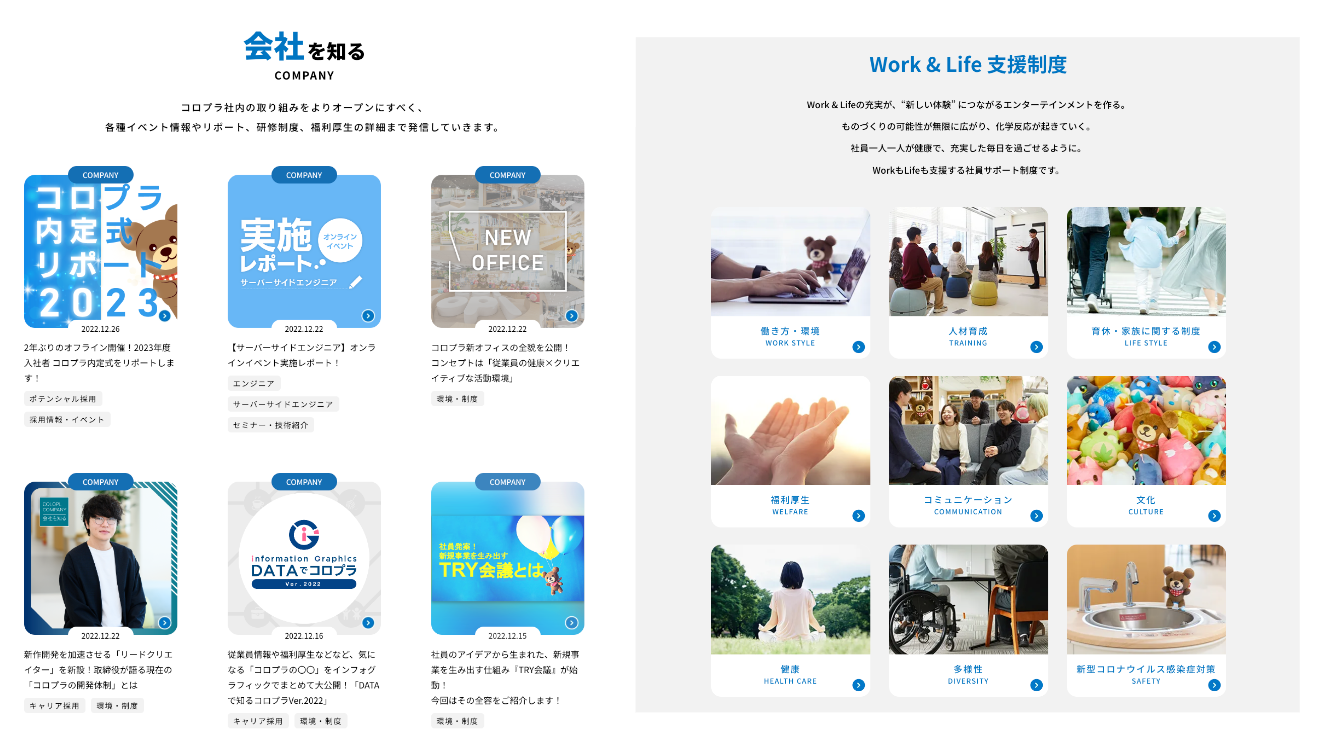 コロプラならではのユニークな文化をはじめ、社員一人ひとりに安心して働ける環境を提供するために、コロプラが取り組んでいる制度、福利厚生などを掲載しています。また、求職者から寄せられる質問についてもQA形式で掲載しています。