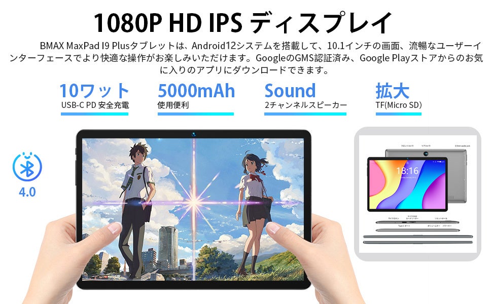 【インセル型ディスプレイ&デュアルスピーカー】MaxPad I9 Plus タブレットは1280*800のインセル型ディスプレイ搭載、10インチ タブレット、視野角の広さと発色のよさが特長のIPS液晶を搭載。正面以外から画面を覗き込んでも、美しい色合いの写真や映像を楽しめます。臨場感あふれるサウンドが体験できる「デュアルスピーカー」を搭載。お子様と一緒に面白いゲームをしたり、音楽を聴いたり、面白いビデオや本を見たりするのに適しています。