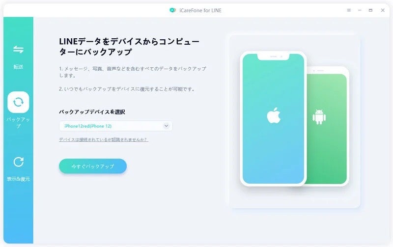 Step2:「バックアップ」機能を選んで、「バックアップデバイスを選択」の項目で接続した端末を選択したら、「今すぐバックアップ」をクリックします。