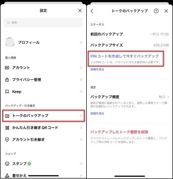 Step1:LINEの設定アイコンから「トークのバックアップ」に進み、はじめてバックアップを作成する場合には「今すぐバックアップ」をタップすると、バックアップの作成後にPINコードを設定できます。