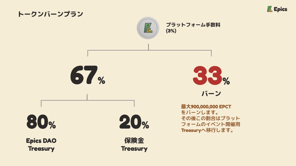 Epics トークンバーンプランによると、Epics プラットフォームの手数料のうち 33%がバーン(焼却)されるようになります。 EPCT トークンの最大供給量は 10 億ですが、バーンにより 1 億まで供給トークンが減少します。