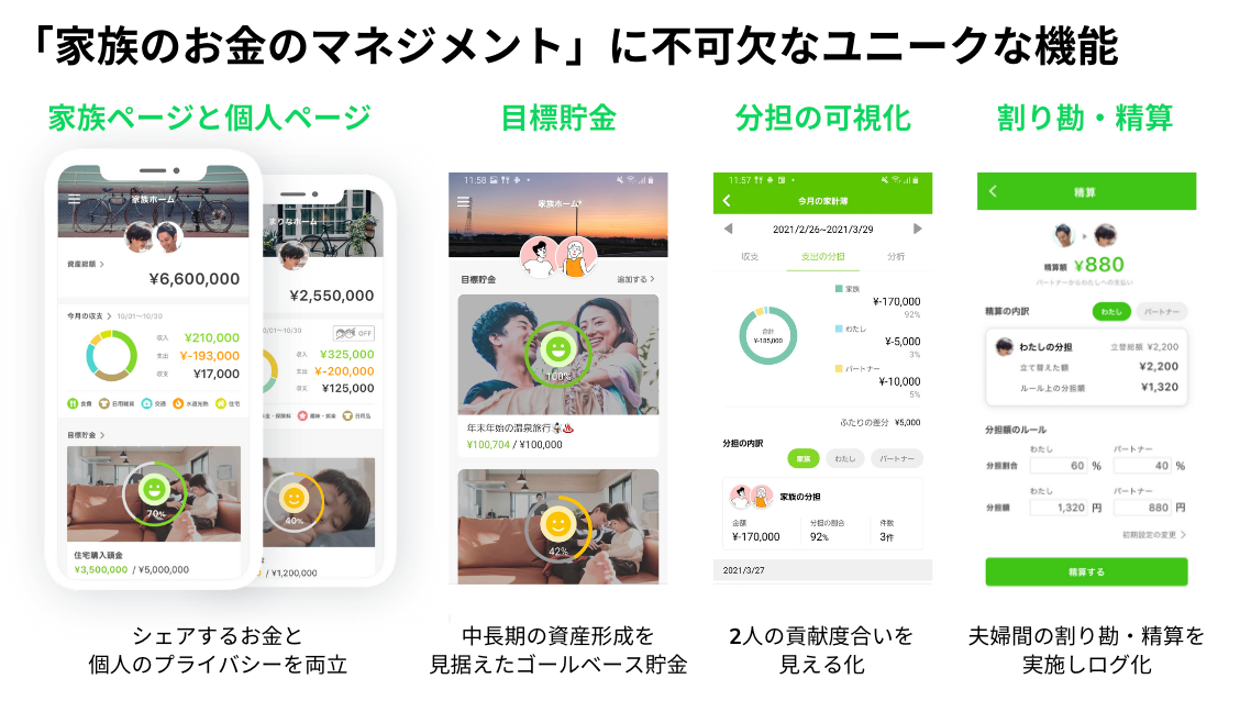 夫婦で誰が何をいくら払ったかを可視化できる、夫婦間で立て替えを精算できるような(近日リリース予定)、夫婦向けならではの機能が搭載されています。