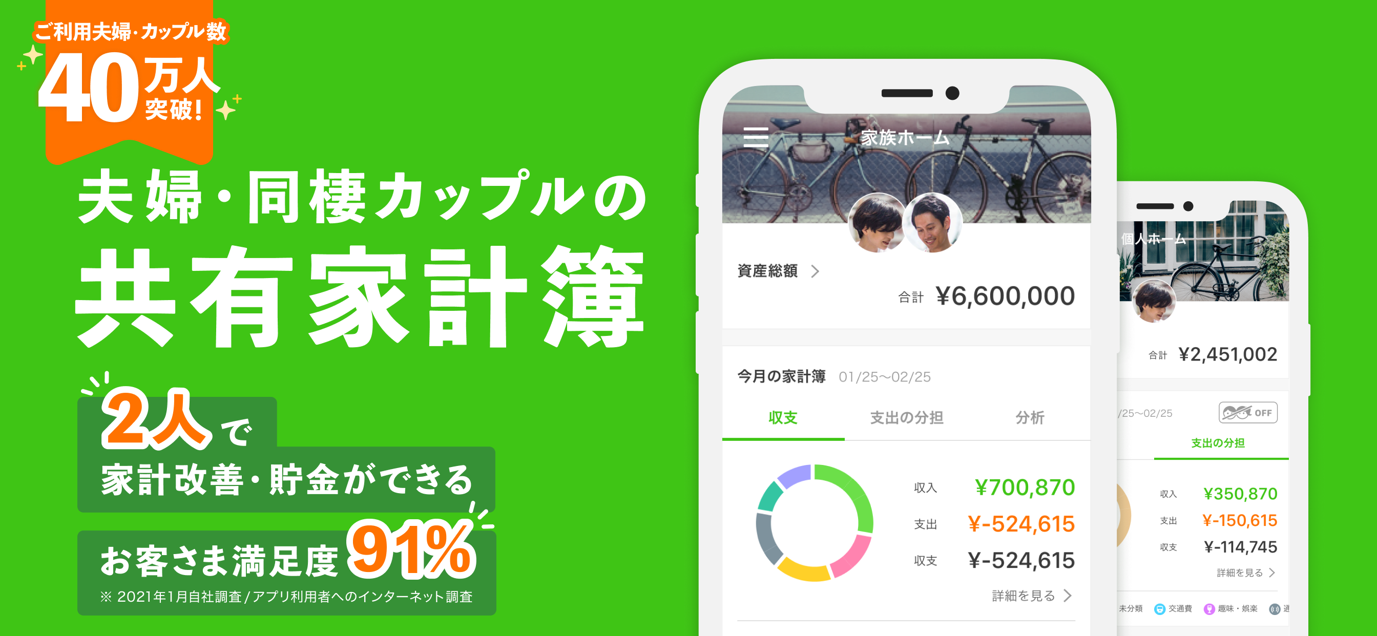 夫婦のお金は家族ページで共有し、個人のお金は個人ページでプライバシーをもって分別管理できます。