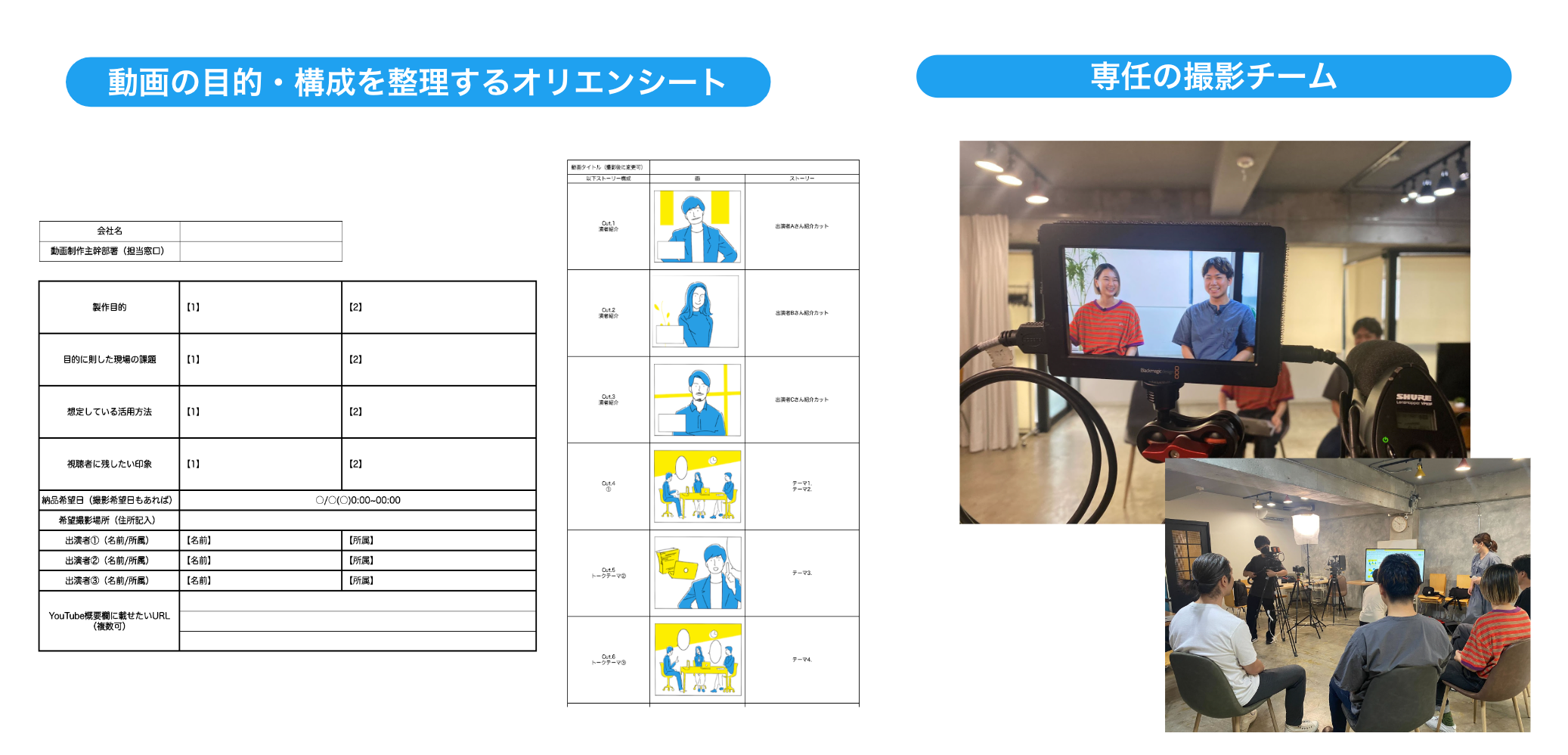 制作を開始する前に、動画制作の目的や伝えたいメッセージ、登場人物などを整理・ディスカッションした上で、3つのタイプから動画フォーマットを選ぶことができます。フォーマットが決まっていることで、動画制作の経験がない方でも悩むことなく、進行することが可能です。