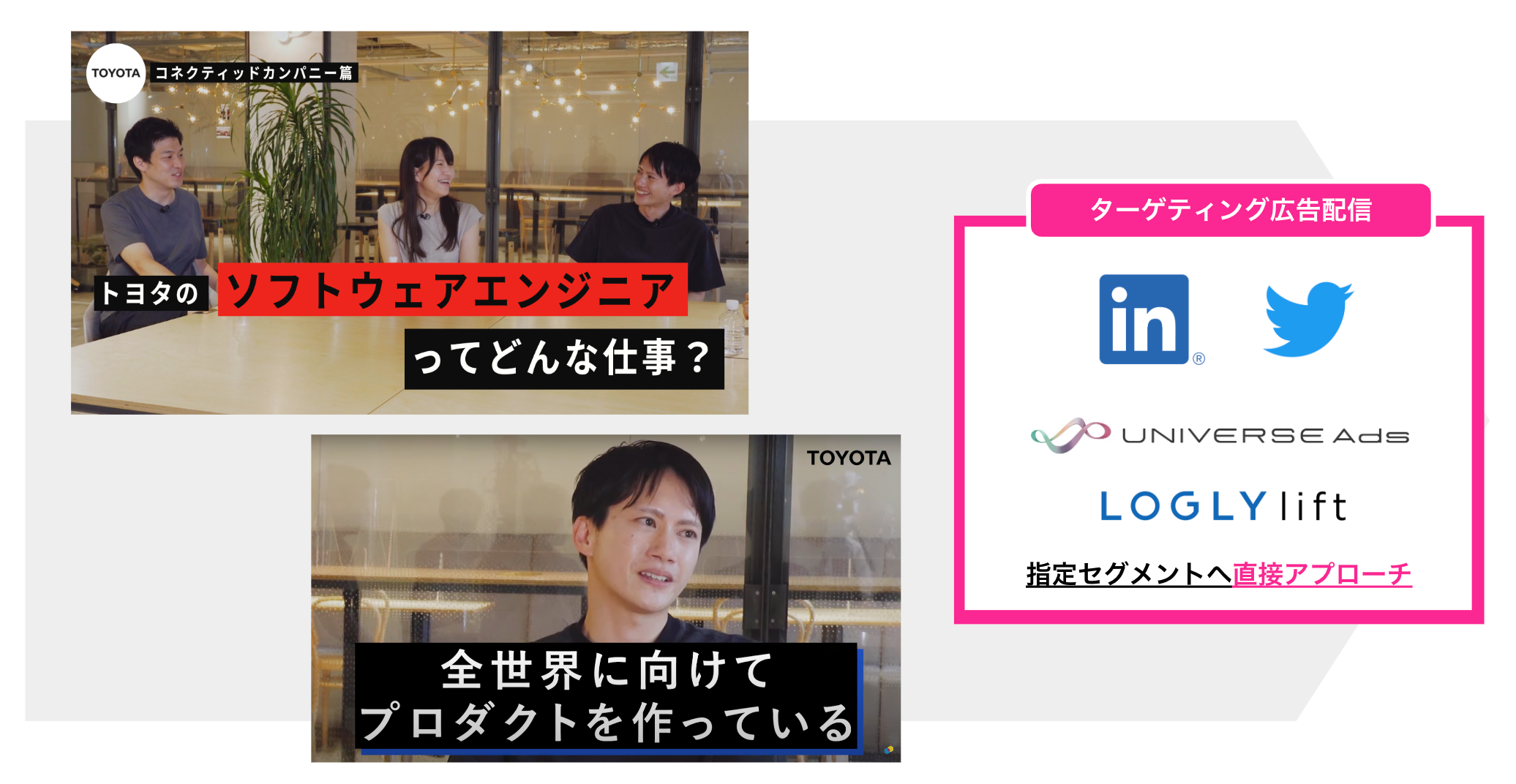動画のダイジェスト版とターゲティング広告を掛け合わせ、自社の魅力を伝えたい採用候補者に、Youtubeや各種デジタル広告を通して直接アプローチすることができます。これにより、自社サイトや求人媒体に訪れない潜在層にもリーチを拡大することが可能です。