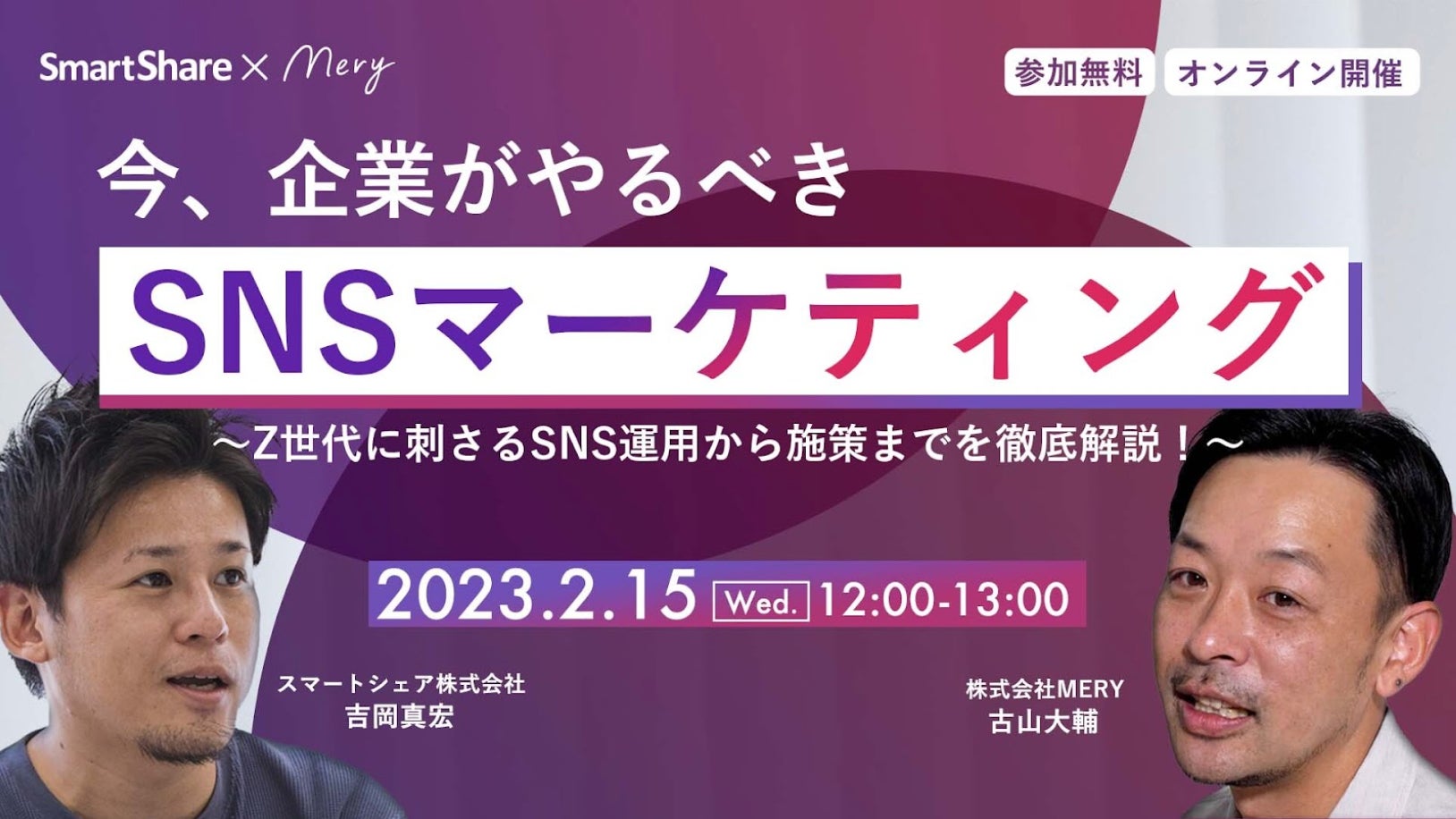 SNSマーケティングプラットフォーム「OWNLY」(オウンリー)を開発・運営するスマートシェア株式会社(東京都渋谷区、代表取締役 西山統)は、株式会社MERY(本社:東京都千代田区、代表取締役社長:藤田 欣司)と2023年2月15日(水)にオンラインセミナーを開催いたします。