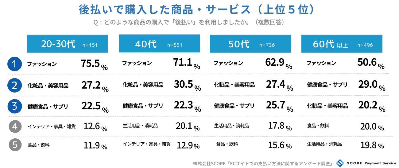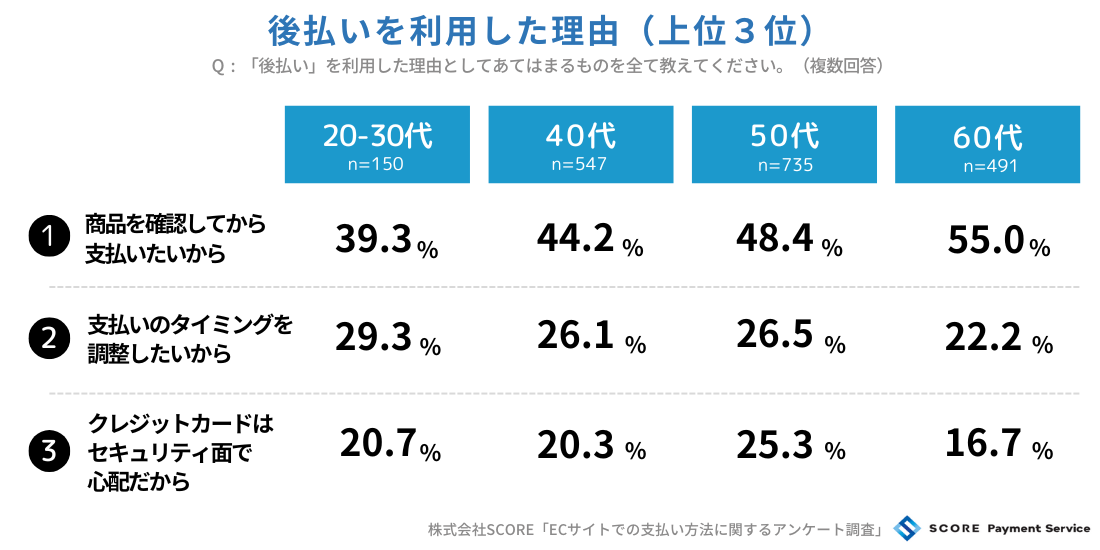 - 後払いを選ぶ理由は、全年代で「届いた商品を確認してから支払いたい」が1位。中高年・シニア層ほど、支払い時の安心感を重視する傾向