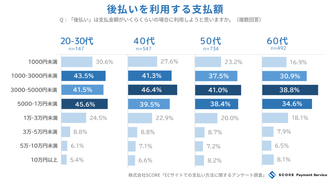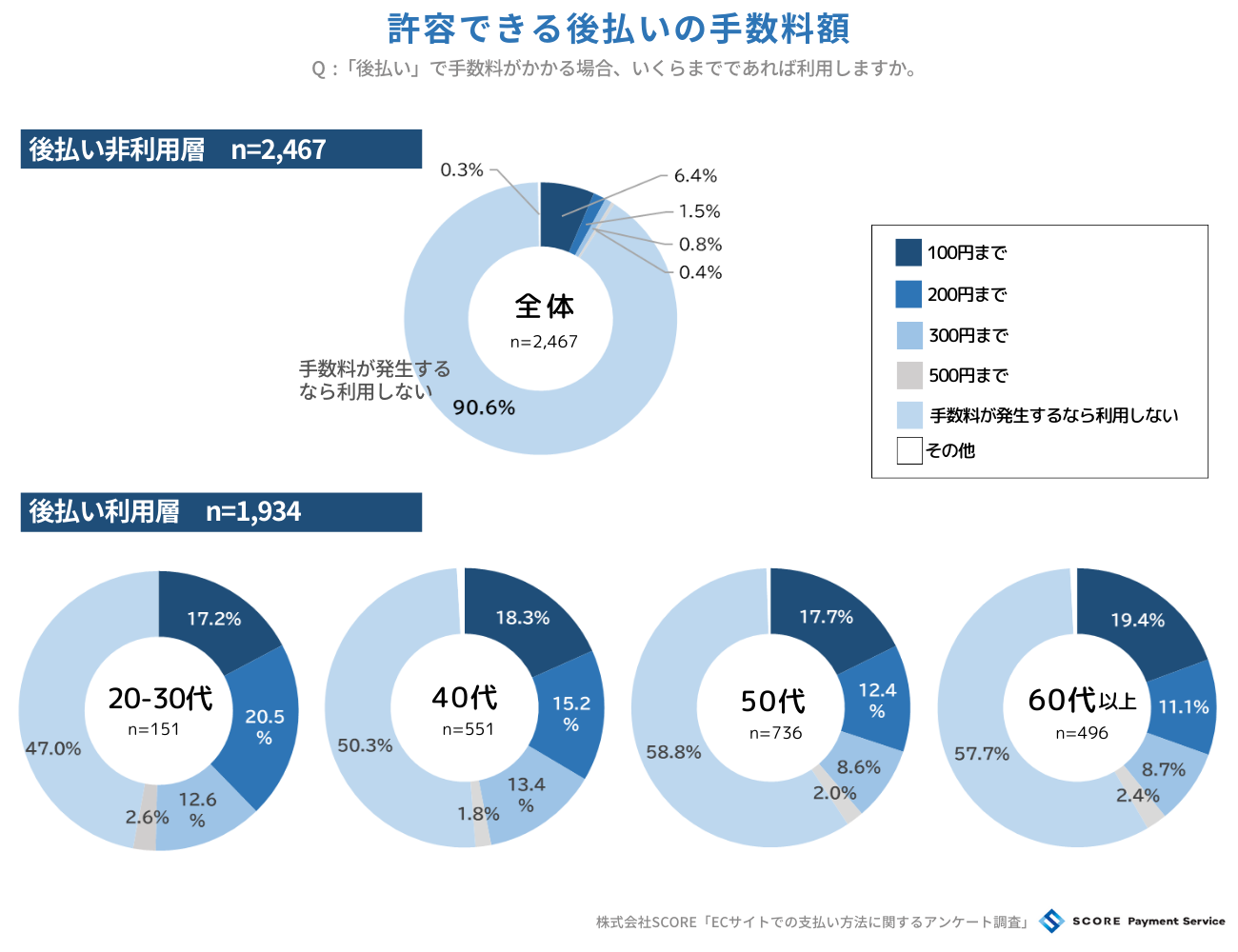 - 後払い利用層は300円を上限に手数料を許容する傾向が見られるが、年代が上がるほど手数料への抵抗感が強い