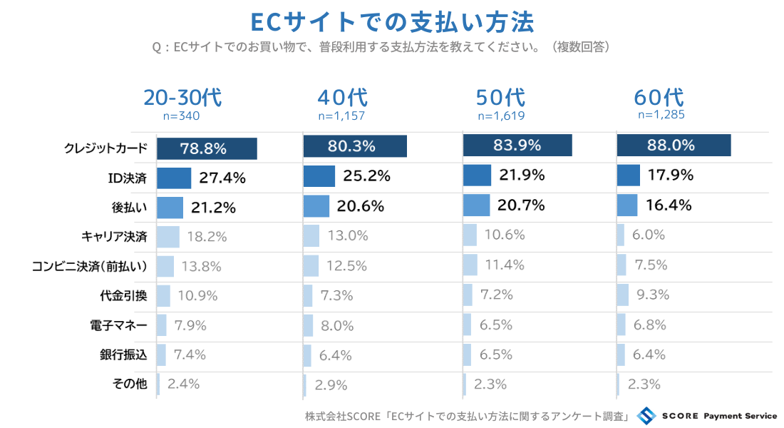 ECサイトでよく利用する支払い方法のTOP3は、全年代ともに「クレジットカード」「ID決済」「後払い」。