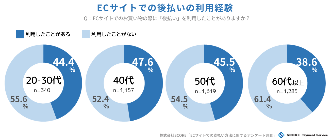 - 年代を問わず約4割の人がECサイトで後払いの利用経験あり