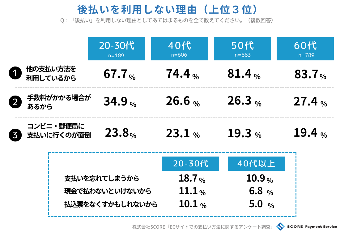 - 後払いを利用しない理由は、全年代で「他の決済方法を利用している」が圧倒的。若い年代は後払いの手間を避ける傾向も