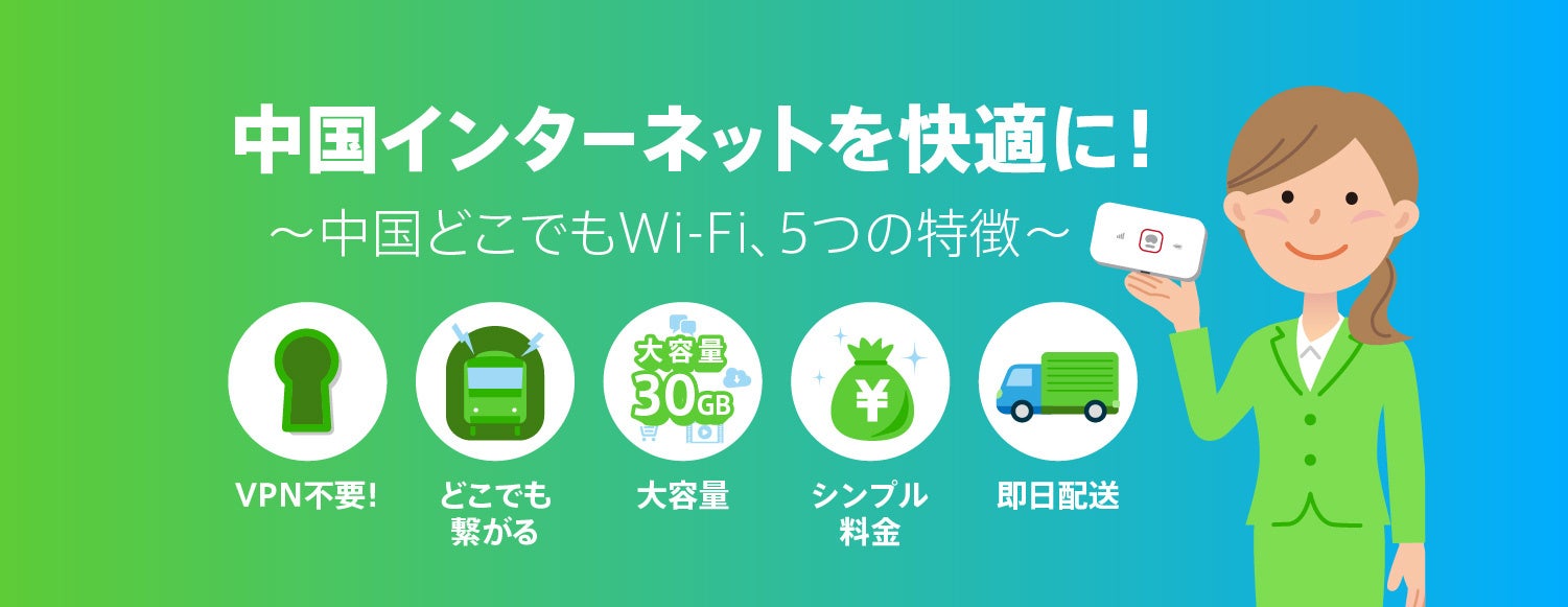 「中国どこでもWiFiレンタルプラン」は、中国でもLINEやGoogle等の日本のインターネットが快適・簡単に利用できるポケット型WiFiです。VPNはもう要らない!ポケット型WiFiを日本で受け取り、安心して中国へ渡航することができます。