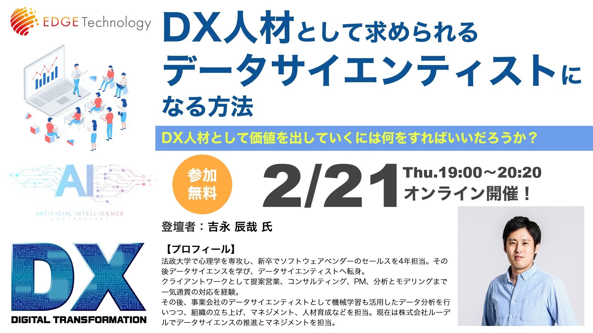 今回は、どのようにDX人材としてキャリアアップするべきか、DXにおけるデータサイエンスはどういったスキルを持ち合わせた人材が必要とされているのか、文系かつ営業という職種からデータサイエンティストに転身した経緯もまじえて、業界の最前線から見えることを事例と合わせてお伝えできればと思います。