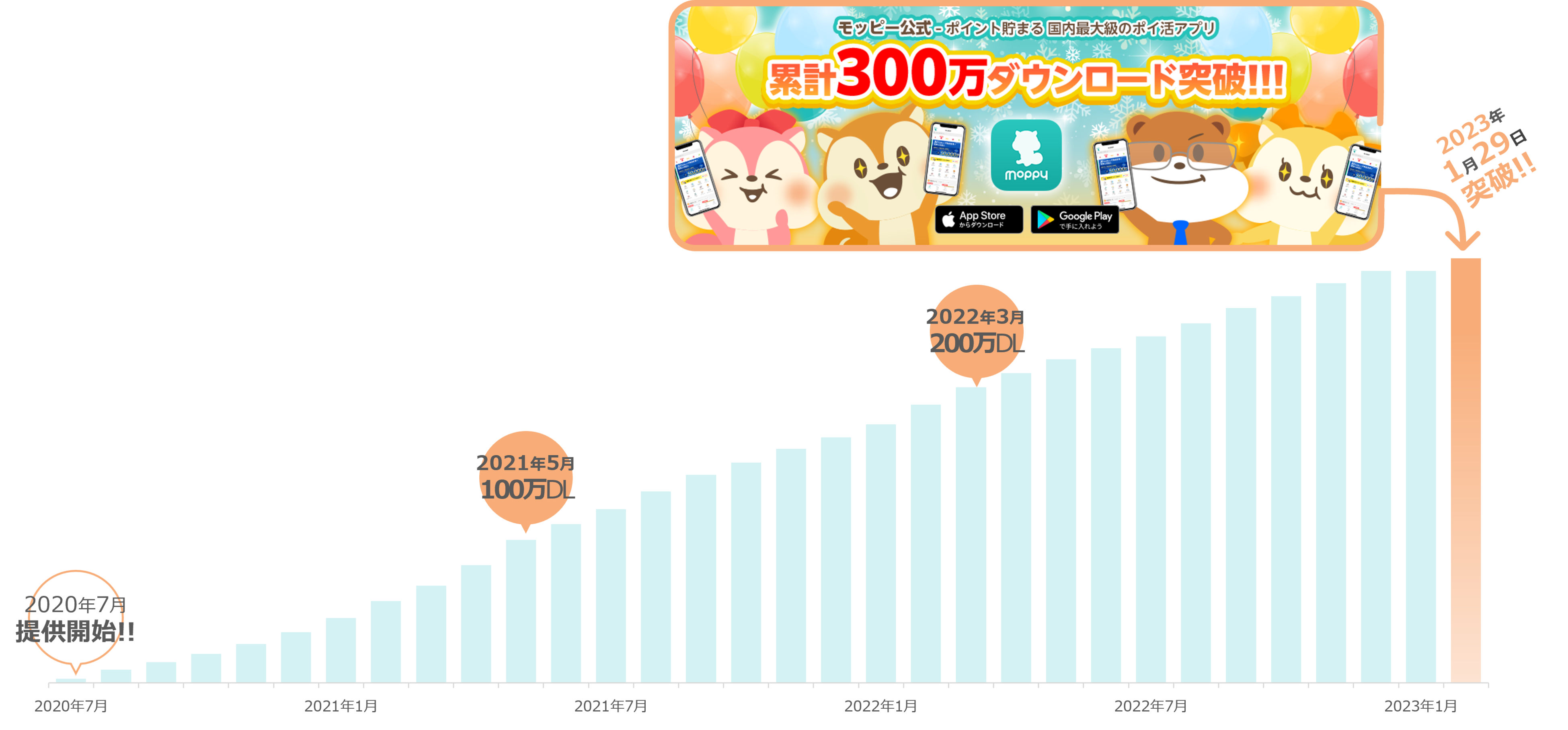 そうした背景を受け、「モッピー」スマートフォン版アプリは提供開始からわずか10ヶ月の2021年5月に100万ダウンロードを達成。翌2022年3月9日には200万ダウンロードを記録し、来る11ヶ月後の2023年1月29日に300万ダウンロードを突破しました。スマートフォン版アプリによって利便性が向上したポイントサイト「モッピー」全体の、アクティブユーザー数は436万人※(前年同期比+18%)と安定した伸びを見せています。