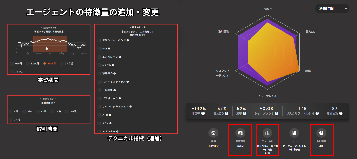 「エージェント」の詳細画面にも表示されている「テクニカル指標」「ニュース」などで、これらは「『エージェント』がどういうトレードをするか」に影響します。