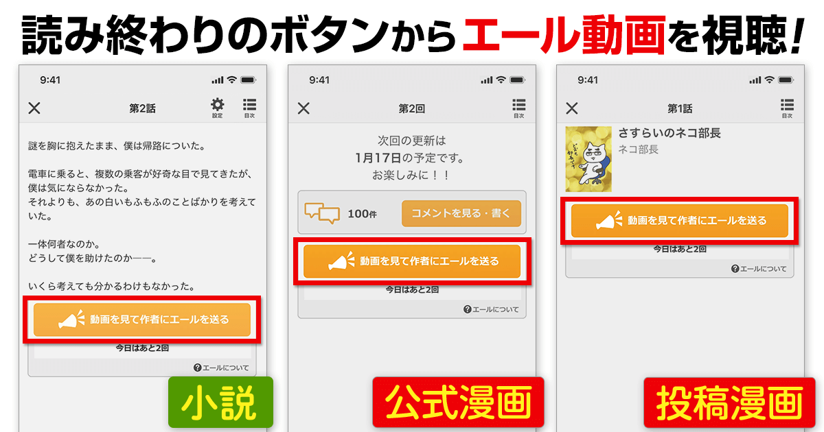 アプリ上のすべての投稿小説・投稿漫画・公式漫画の話の読み終わりに設置されたボタンをタップして広告動画を再生することができます。
