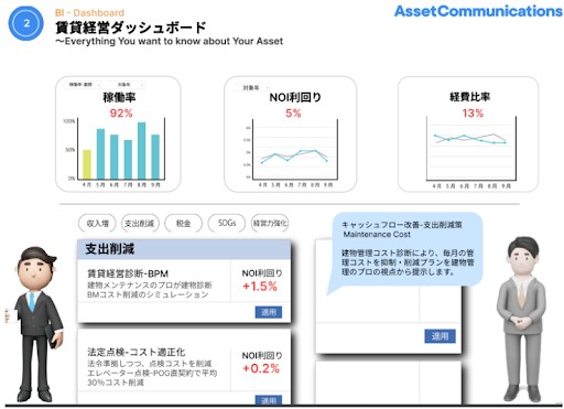 - 経営力向上:賃貸経営ダッシュボード(分析と提案)、節税、相続対策、大規模修繕メンテ適正化診断