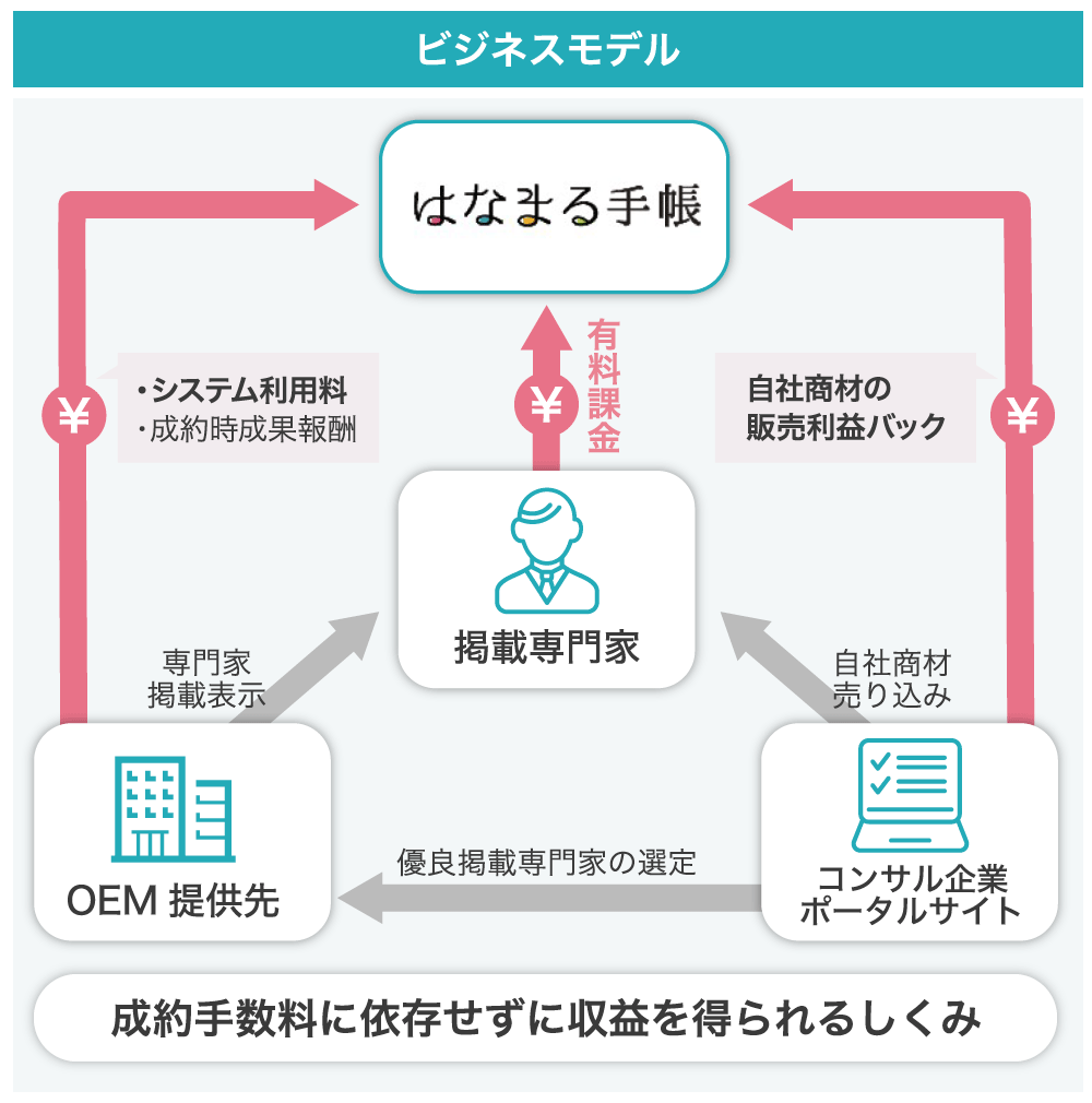 弊社が運営する「はなまる手帳」は、後期高齢者の子世代をターゲットとし、成約手数料に依存しないビジネスモデルを構築しており、収益の柱は以下の3つです。