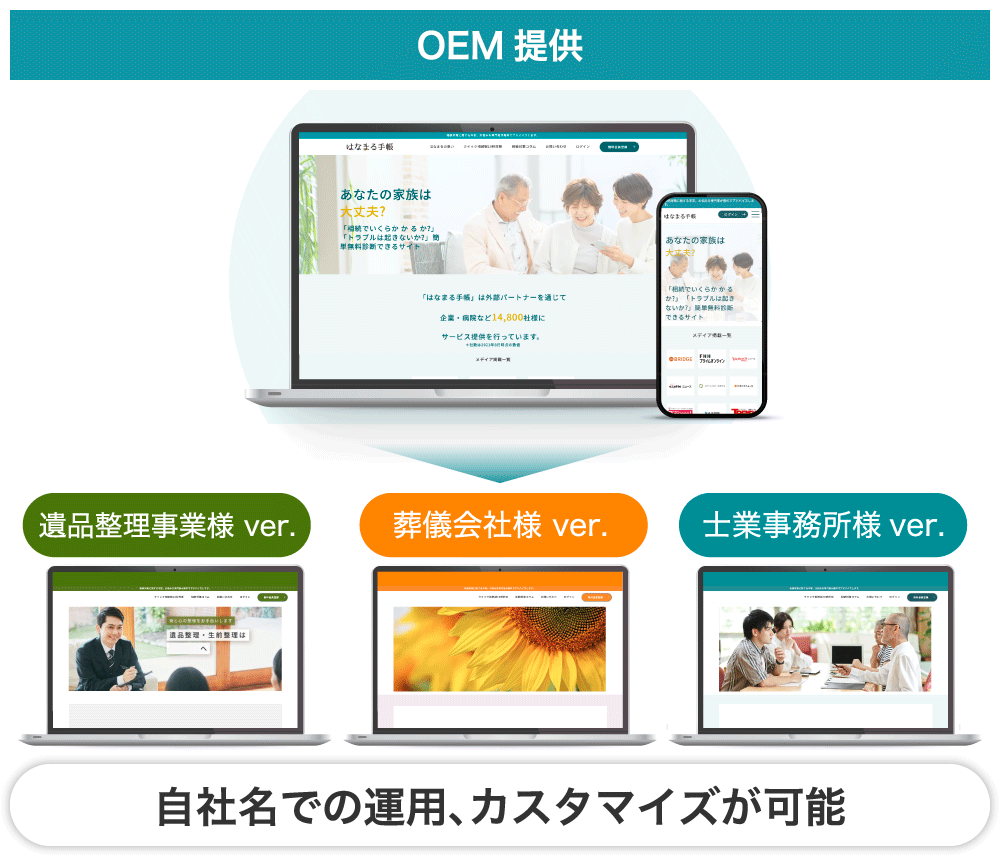 株式会社はなまる手帳の運営する「はなまる手帳」は相続、税務、保険、葬儀、遺品整理、不動産売却などの現在のマーケットにおいて、それぞれ縦割りで情報が分断されていた分野をすべてワンストップでカバーできるサービスです。また、「はなまる手帳」には、資格チェックを経た1,000人以上の専門家が登録しており、専門家同士をマッチングして異業種連携を支援する場でもあります。さらに、これまでオフラインで相続や保険に関する相談会を実施してきた銀行や企業に「はなまる手帳」のシステムをOEM提供することで、ワンストップの相続・終活相談のオンライン化が実現できます。