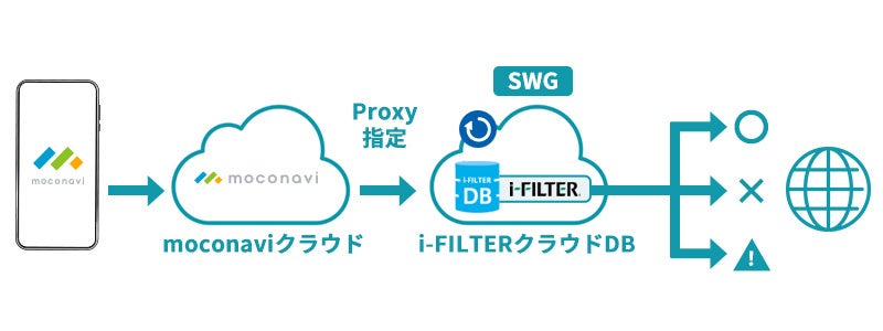 今回の「moconavi」と「i-FILTER@Cloud」とのサービス連携で、「moconavi」の特徴であるVPNを使わずにクラウドサービス利用の安全性を確保するリモートアクセス機能に「i-FILTER@Cloud」のSWG(セキュアWebゲートウェイ)機能と強力なフィルタリング機能が加わることで、安全性が確認されたURLにのみアクセスを許可する「ホワイト運用」方式にてフィルタリングが行われるため、安全なWebアクセスおよびクラウドサービスの利用が可能になります。